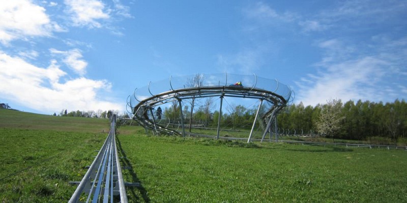 Dráha o délce 1100 m, 13 velkými zatáčkami, spirálou a množstvím menších zatáček a umělých vln. Vhodné pro děti i dospělé. Video Výleťák, WWW